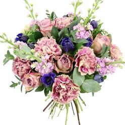 Our Vibrant Elegance Bouquet is a masterpiece of floral artistry, featuring an array of blue hydrangeas, light purple roses, green lisianthus, white spray roses, Ammi visnaga, pink bouvardia, and pink astilbe. Each flower is carefully selected for its freshness and quality, ensuring a stunning and long-lasting display.