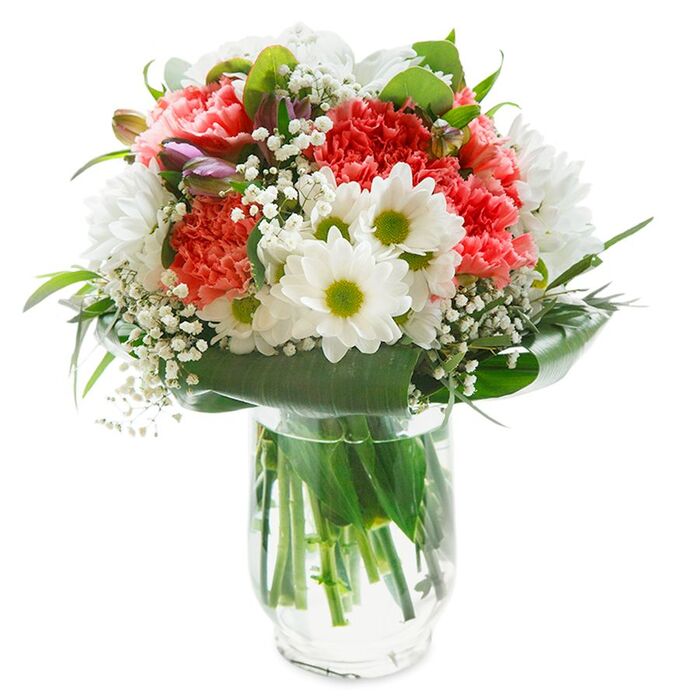 Present a captivating and elegant gesture with our flower arrangement. This exquisite bouquet features snow-white chrysanthemums, airy gypsophila, and light pink carnations, expertly combined with lush aspidistra leaves for a stunning display.